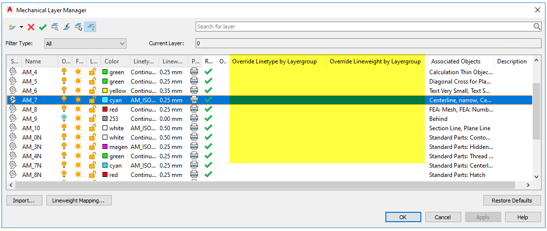 | AMLGLWMODE | Makes the Layergroup Lineweight property available for editing. |