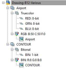 As shown in the figure, each data definition includes one or more band groups (examples: Truecolor and Bitonal) with subordinate bands. At the same level as the band groups are color maps (examples: RGB and BIN). Image insertions are placed subordinate to the color maps that define them. The location of the image insertion on the tree is a major difference between the Image Insertions view and the Image Data view.