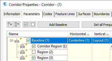With long corridors or corridor networks, create multiple regions for modeling purposes. Normally, corridor regions are used to mark the use of different assemblies, with a region boundary occurring where the use of one assembly ends and another begins. But you can also add regions without changing assemblies. The value of additional regions is control—you can use the Corridor Properties dialog box to turn off the modeling of regions not required for current operations, as shown in figure 13. This improves the speed of corridor rebuilding.