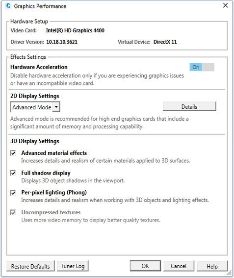 You can also use the -GRAPHICSCONFIG command at the command line to access more options. For more information, please see the AutoCAD Help.