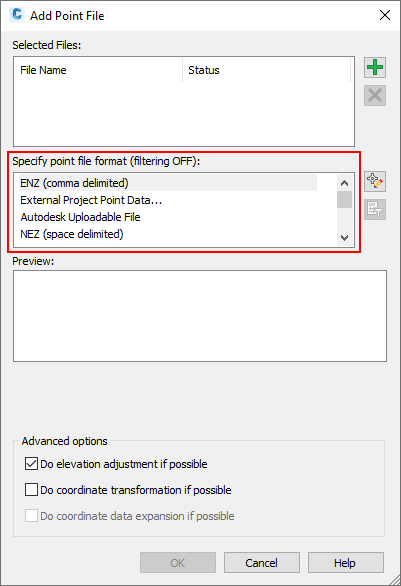 This is an example of adding a PENZD format point file to an existing surface. The file in this example is from the Civil 3D tutorials directory.