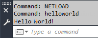 You can now build the assembly and run it. Start Autodesk Civil 3D, and type NETLOAD at the command line. In the Choose .NET Assembly dialog, browse to your assembly DLL (if you are using the project settings from step 1, this will be GettingStarted.dll). Type HELLOWORLD at the command line, and you will see the command output: