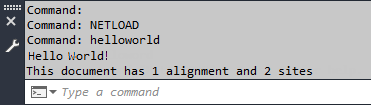 Open or create a document in Autodesk Civil 3D that contains alignments and sites. When you run the HELLOWORLD command now, you should see output similar to this: