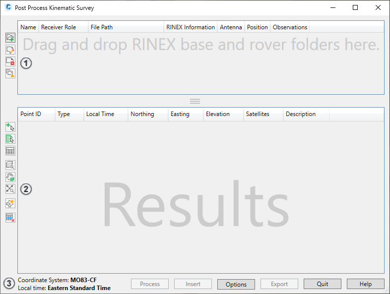 3. Post Process Kinematic Tools. View the current coordinate system and access tools for processing data, inserting processed data into the drawing, exporting processed data, and other options.