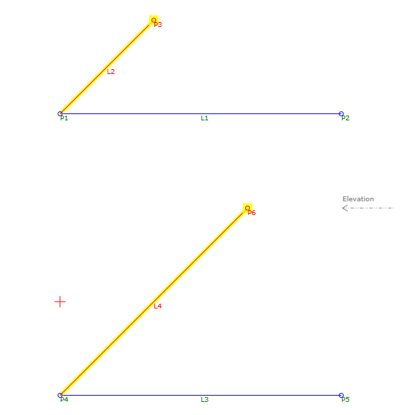 The example PKT contains two Angle and Delta Y point examples. Each Point Geometry Type is defined by Angle and Delta Y parameter values, and the Delta Y value may be overridden by a specified elevation target parameter. The same Delta Y value is used in both examples. The Static Delta Y (P1 to P3) example applies the value, but the Elevation Target example uses an elevation target parameter that overrides the static Delta Y value.