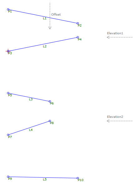 The example PKT contains five Slope and Delta X point examples. Each Point Geometry Type is defined by Slope and Delta X parameter values, either of which may be overridden by specified target parameters. The same Slope and Delta X values are used in all five examples. The Static Values (P1 to P2) example applies the values, but the remaining examples use target parameters that override the static values.