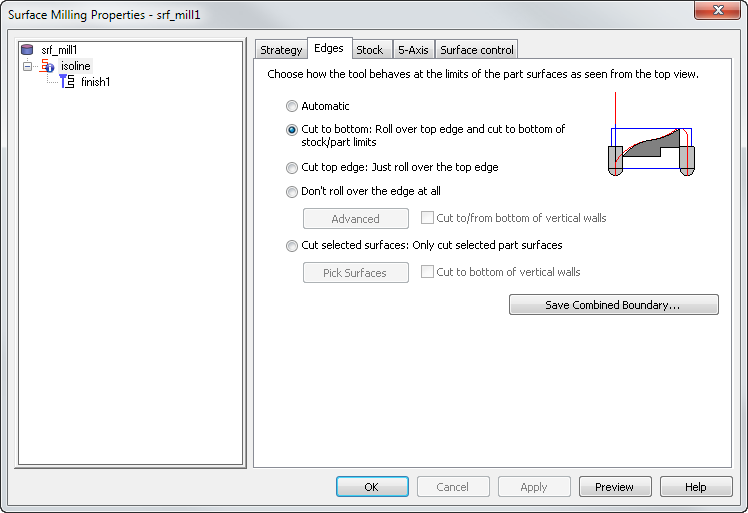 You can use the Edges tab of the Surface Milling Properties dialog to specify how the tool behaves at the edges of the surface.