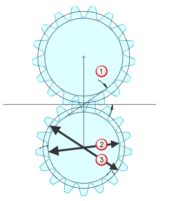 - Pressure angle — Enter the acute angle, in degrees, between the tangent to the two base circles and a normal to the line connecting the gear centers.