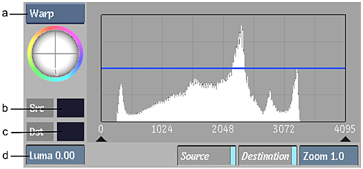 The Dst Colour pot dynamically updates to reflect your changes. When you release the mouse, the Src Colour pot is updated to match the destination colour. In the 2D luma histogram, the cyan bar moves to reflect the changes you are making to the luma content.