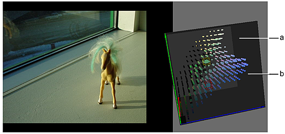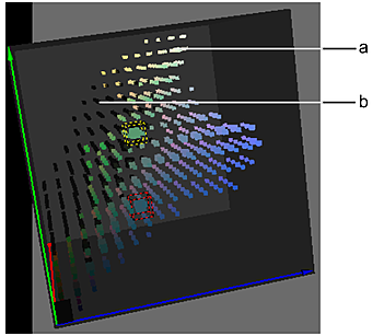 3DDisplays the 3D vectorscope. Use the 3D vectorscope to both analyse the colour content of the clip and to locate specific colours in terms of their chroma and luma values. When you view a clip in the 3D vectorscope, you see it in terms of HLS (hue, lightness, and saturation). Its X, Y, and Z axes represent red, green, and blue, and the size and placement of the colour cubes show the distribution of all the colours of the clip in RGB colour space.