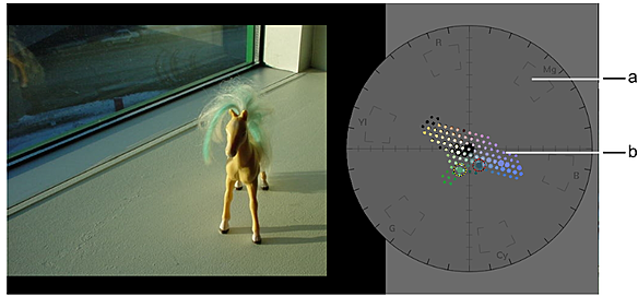 The selected vectorscope is displayed in the image window. As you scroll through a clip, the histogram is updated to display the colour distribution of each frame.