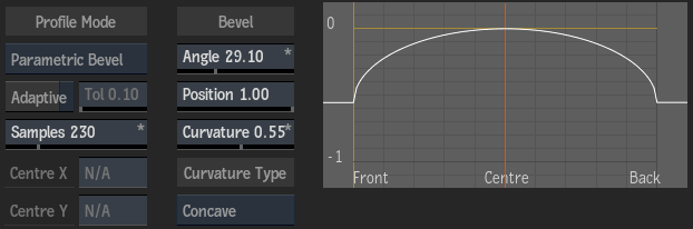 Use the profile curve in the Profile tab to scale, rotate, or create a bevelled edge on your extruded 3D text. You also have access to a parametric bevel curve to simplify the creation of common shapes, such as rounded profiles. Select which type of curve to work with, then use the menu settings and the options below the curve or in the Tools box to add, select, delete, or move keyframes on the curves. The curves behave in much the same way as an animation curve in the Channel Editor. Experiment with different curves to create different effects.