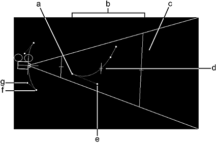 (a) Near sharpness plane  (b) Focal range  (c) Far sharpness plane  (d) Motion path for point of interest  (e) Camera point of interest  (f) Motion path for camera eye  (g) Camera eye