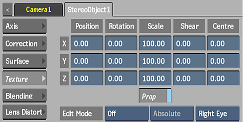 The Position, Rotation, Scale, and Centre settings are the same as in the Axis menu. The following Axis settings are specific to the Stereo Object: