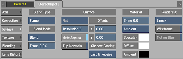 Use the Surface tab of the Stereo Object menu to adjust surface and shading properties of the stereo object.