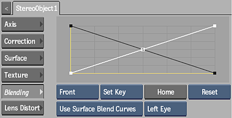 Use the Blending tab of the Stereo Object menu to adjust the blending curves of each stereo surface separately. The blending curve is similar to the Keyer luminance blending curve, but you can adjust it per eye.