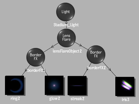 In the Action schematic, the components are attached to a Border FX object that is itself attached to the Lens Flare object. You can use multiple Border FX objects to achieve the lens flare look you want. For example, attach a ring and glow to one Border FX object, while a streak and iris are attached to another Border FX object. In this case, you can control how the lens flare behaves when it reaches the borders of your image differently for the components under each Border FX object.