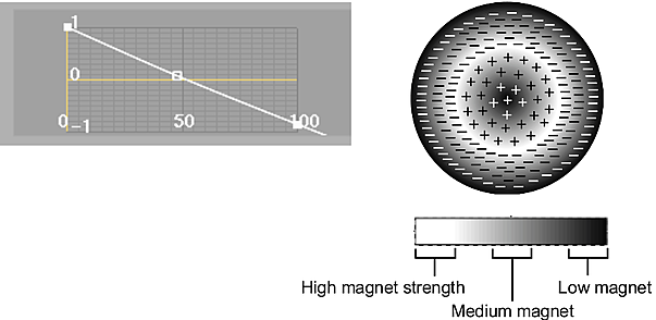 Use the Magnet Curve Editor to define the weighted polarity from the centre to the edge of the magnet. Points are either attracted or repelled depending on their location in the magnet and the shape of the magnet curve.