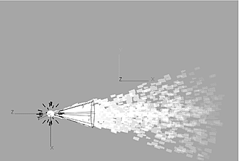 The following example illustrates how to make particles become transparent as they reach the end of their lifetime using the expression transparency = lifetimeI. The settings in the Particle Manipulator menu, Particle Generator menu, and the resulting effect are shown.