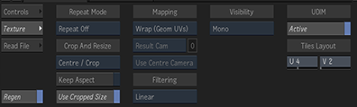Every Texture Map Texture menu has a UDIM section to apply the UDIM scaling, based on the number of tiles contained in the resulting texture. On import, if UDIM is enabled, it is set automatically to Active with the appropriate U and V values. Whether the resulting texture comes from MediaHub or Batch, you can set the U and V values for the grid, allowing the scaling to be properly applied.