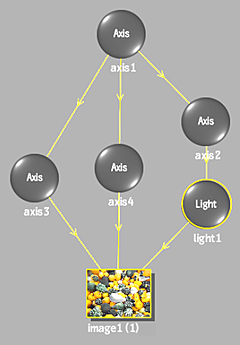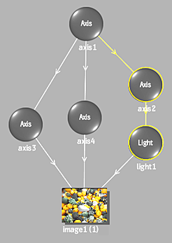 These objects include generators, bouncers, deformations, surfaces, texture maps, shadows, geometries, and 3D text. When one of these objects is selected in the schematic, an ascending (bottom-to-top) scanning of branches is performed. The hierarchical scanning stops for any given branch when an axis or object with axis attributes is encountered.