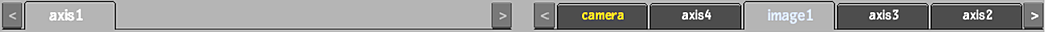 The tabs in the Object menu appear as follows. The image1 tab appears in light blue to signify that multiple objects are connected down to it. Use the tabs to switch between menus within the Object menu. The Camera tab appears in orange as the first tab on the right side of the Object menu, and is exempt from the tab population rules.