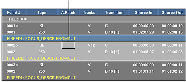 The source tracks that have been patched to different audio tracks than the defaults are indicated in the affected event's Audio Patch Field. Dashes in the Audio Patch Field indicate the track is patched to its default. Comments are also added which indicate the name of audio tracks and their patching information.