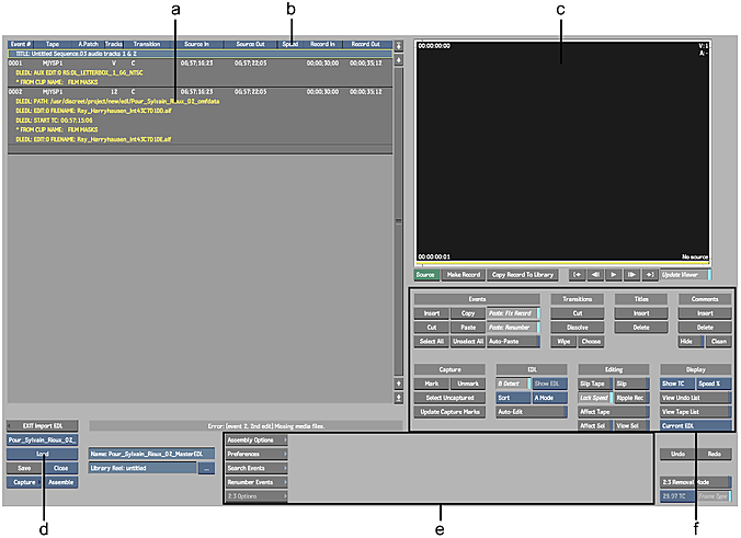 (a) EDL work area (b) Work area column headers (c) EDL Player (d) Load button (e) Import EDL menus (f) EDL editing tools