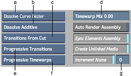 (a) Dissolve Curves box (b) Dissolve Type box (c) Transitions Alignment box (d) Timewarp Mix field (e) Transition Render Option box (f) Timewarp Render Option box (g) Increment field