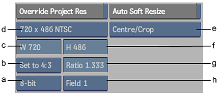 (a) Frame Depth box (b) Aspect Ratio Presets box (c) Frame Width field (d) Resolution Presets box (e) Fit Method box (f) Frame Height field (g) Aspect Ratio field (h) Scan Mode box