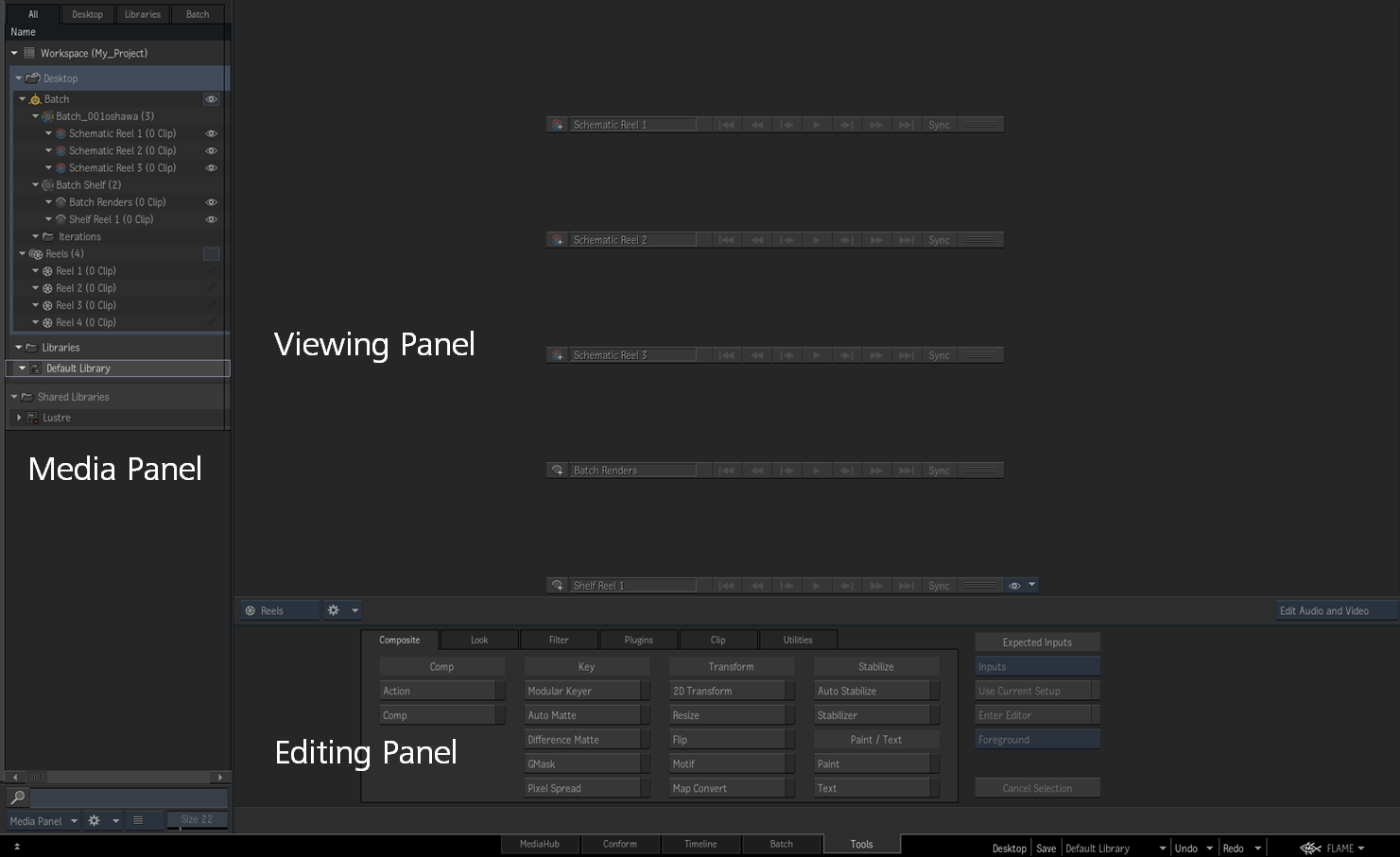 It is possible to hide the Editing panel area in the Conform, Timeline, and Tools tabs by performing a Ctrl+Swipe at the bottom of the screen. By doing so, you end up with a full height version of the Viewing panel (Player, Source-Sequence, Triptych, Freeform, Desktop Reels, or Conform list). Viewing panel areas other than the Conform list can also be displayed in a full screen manner if the Media panel is hidden.