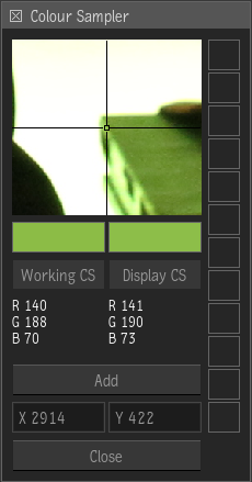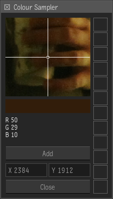 The Colour Sampler enables you to sample colours with precision, while displaying the pixel coordinates, associated to the selected pixel, in realtime, whether the image is static or changes from frame to frame. Sampling colours with the Colour Sampler automatically adds the selected colours to the Colour Picker’s custom colour pots. Hence, the Colour Sampler enables you to sample colours precisely and efficiently and easily build a palette of custom colours, in the Colour Picker.