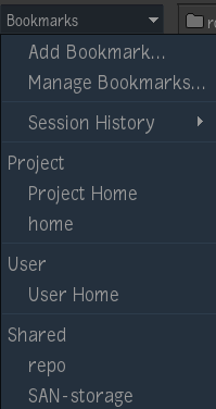 Bookmarks are available in both the MediaHub and the File Browser. The Bookmarks menu holds your bookmarks, while also giving you access to the Bookmarks Manager and a Session History menu.