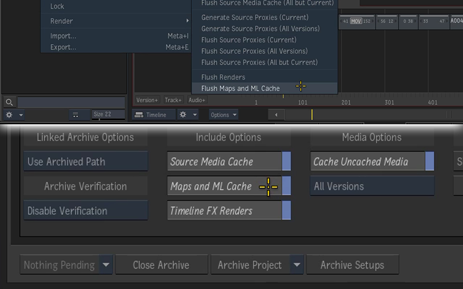 CLI archiving. A new option for the flame_archive command line tool. You can now add maps to the list of media to omit when using the -O switch in flame_archive. Using this option, all the Maps and Machine Learning media caches attached to clips are excluded from the archive.