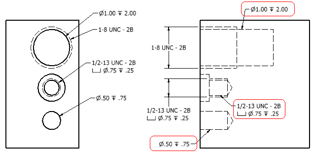 | LinearDiameterType | Boolean | Optional Input Boolean that specifies whether to create a leader type of note or a linear diameter type of note. There are two examples of linear diameter types in the figure above. These are the uncircled notes in the right view. The three circled notes illustrate a leader type of note. This is an optional argument whose default value is False. |