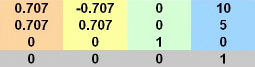 Imagine a vector pointing along the required X axis. Remember we now want this to be at 45 degrees, so this can be thought of as pointing at 1,1,0. However, it's often convenient to use the UnitVector object, which always has a unit length of 1. So the direction vector actually points to 0.707, 0.707, 0. The Z axis does not change, but the origin becomes 10,5,0. A 3D matrix to represent this would appear as follows. Reading the columns left to right, they are X Y Z, and origin.