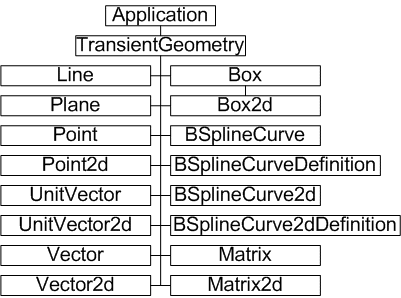 The TransientGeometry object allows the creation of a number of transient geometry objects. These objects do not represent actual graphical geometry. Transient geometry objects are used for mathematical calculations. Two of the most commonly used objects include points and matrix objects. Matrices allow accurate placement and movement of components.