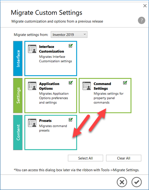 When installing a new version of Inventor, you can migrate certain settings from a previous release. You select which group of settings to migrate.