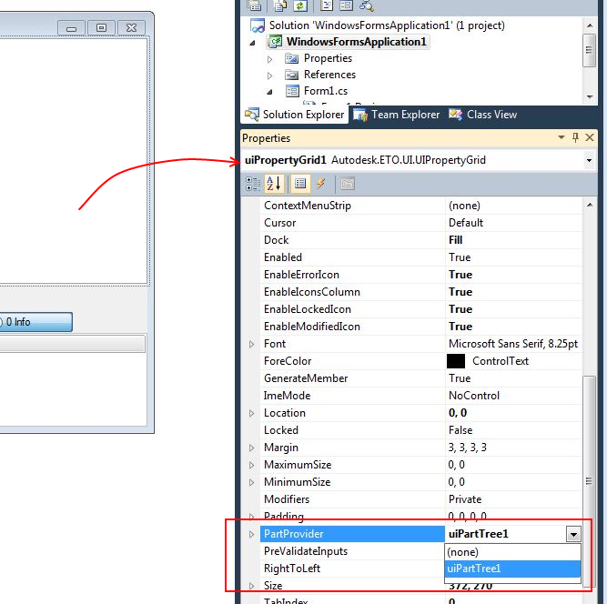Now the controls are on the form where we want them. Next, wire them up to the IntentUIProject component we added originally. The simplest method is to set their PartProvider properties from within the Visual Studio designer. Set the part provider for the UIMessages control and the UIPropertyGrid control to the UIPartTree control: