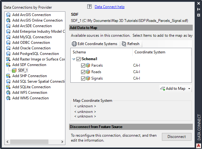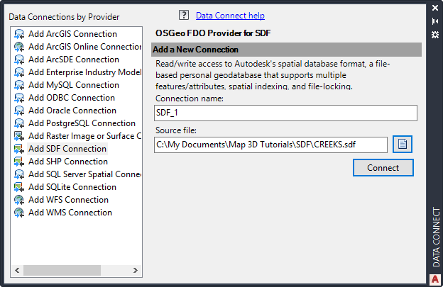 In this exercise, you connect to the new SDF file you created and see the feature classes that were created from the three object classes.