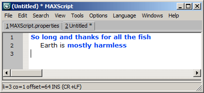 The MAXScript-specific language settings of the Tabbed MAXScript Editor introduced in 3ds Max 2008 can be customized by editing the file MAXScript.properties located in the 3ds Max root folder to include user-defined keywords that are not part of the MAXScript language.