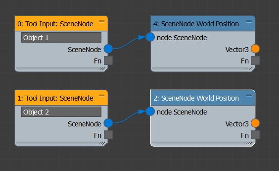 Open the MCG editor to create a new graph, using Scripting > New Max Creation Graph. Since we are controlling the position of two objects relative to a third, we need two inputs. The input for an object in the scene is Tool Input: SceneNode, which you can find under Inputs > Tools in the Operator Depot. Drag two Tool Input: SceneNode operators onto the graph, and name them "Object 1" and "Object 2".
