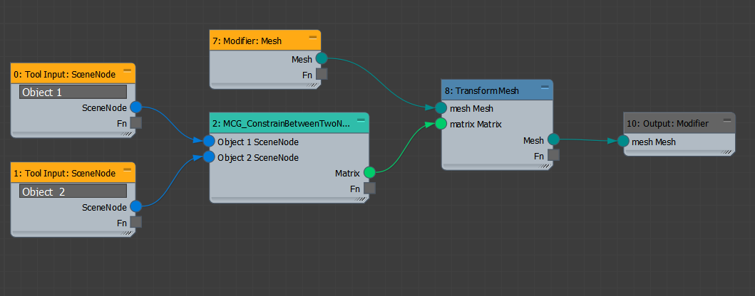 We will start by creating a mesh modifier which constrains the mesh between two objects, and then simplify it by converting some of the graph logic into a compound.