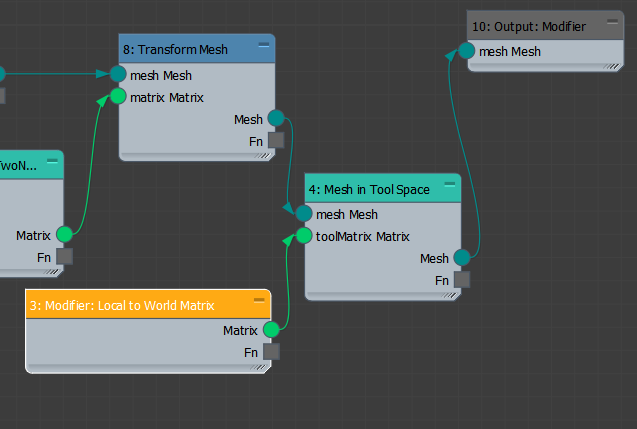 Let's make some improvements to our modifier. We can avoid the requirement of placing our modified object at the world origin [0,0,0] by converting the transformed mesh into Tool Space. We do this by adding a Modifier: Local to World Matrix operator (Inputs > Tools) to our graph, and feeding it into a Mesh in ToolSpace operator: