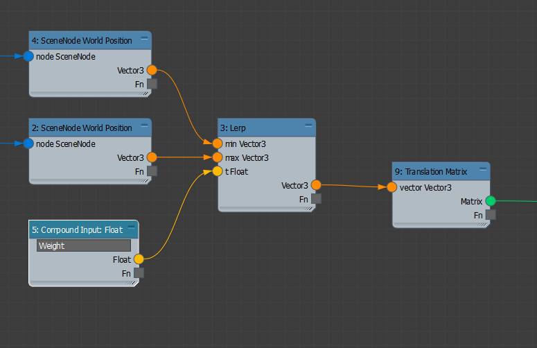 We are now ready to convert the "logic" of the graph to a compound. In the MCG Editor, select the middle part of the graph: everything from the two SceneNode World Position nodes to the Transform Matrix node, and copy (Ctrl+C or Edit > Copy). Open a new graph via File > New in the node editor menu, and paste the content: