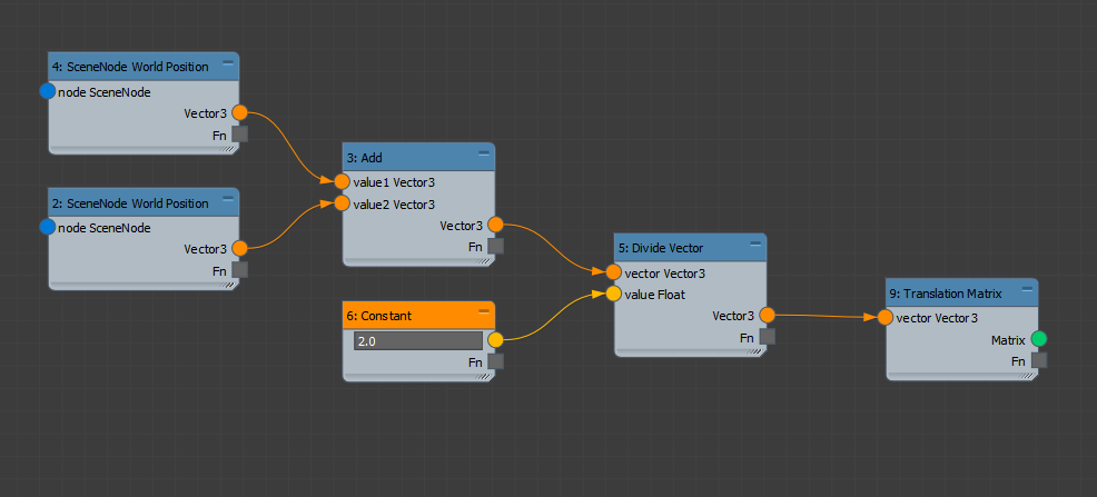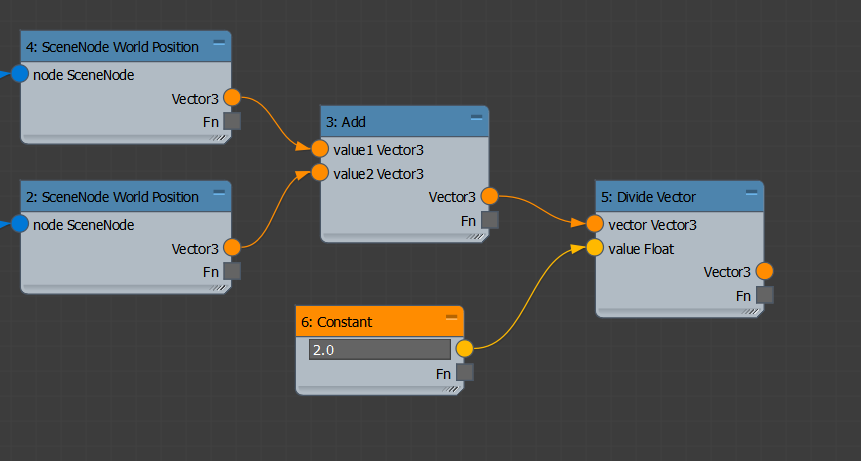At this point we want to calculate the position between the two selected objects. We'll do this by adding the two object positions and dividing by 2, to get the "average" position. Add the Add operator to the graph (Math > Basic), and wire the two world positions to it. Wire the output of the Add node to the vector input of a Divide Vector (Math > Vector), and wire a Constant of 2.0 (Core > Constant) into the value input: