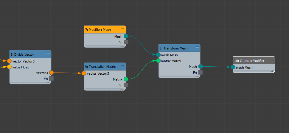 If you try to wire the Vector3 output of the Divide Vector node to the matrix input of the Transform Mesh node, you'll notice that the wire is red. This indicates an issue - in this case, the two types are incompatible. We need to convert the Vector3 output to a matrix value.