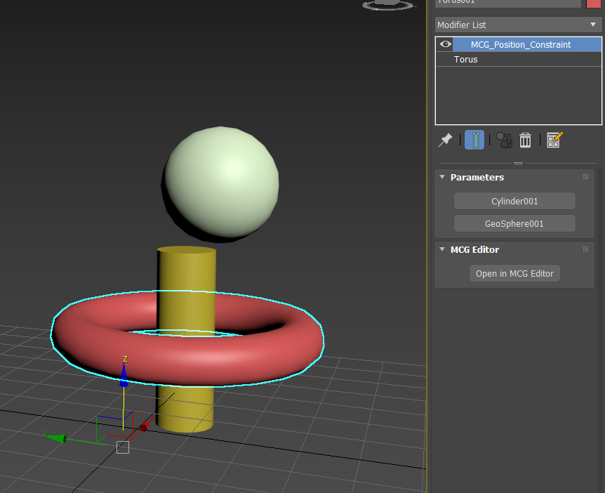 Evaluate the graph, and test it in a scene: create three different geometry objects in a scene - we'll call them A, B, and C. Make sure object C is centered at [0,0,0] in the scene, and apply the MCG_Position_Constraint modifier to it from the modifier list. Set "Object 1" to A and "Object 2" to B, and confirm that changing the position of either A or B affects the position of the modified object C. In this example, the modifier is applied to a torus: