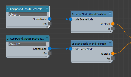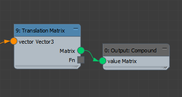 Compounds require compound-specific inputs and outputs. Add an Output: Compound (Outputs > Compounds) to the output of the Translation Matrix. Right-click the two SceneNode World Position nodes and select Generate Compound Inputs. These should be re-named "Object 1" and "Object 2", and will become the inputs of our compound when used in another graph.