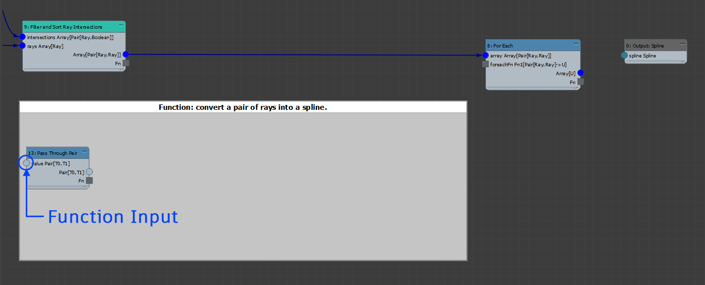 Once these connections are made, connect the Fn output from Spline from Points into the foreachFn input. The square Fn connectors are referred to as "Function Connectors". These convert the connected nodes into a function. The unconnected node inputs within a function act as that function's inputs. In our case, the function only has one input, namely the pair of rays: Pair[Ray,Ray]. See here for more information on functions.